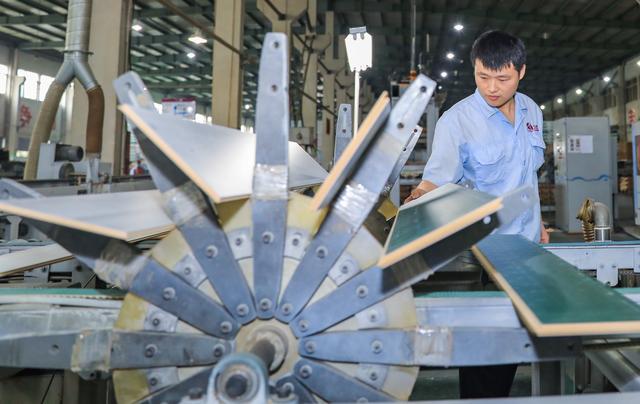 10月20日,記者在位于湖州市南潯區南潯鎮的久盛地板有限公司生產車間內看到,在機械手臂的揮舞中,一塊塊木地板順利下線,即將發往全國各地。因為用了低揮發性的水性漆,車間內幾乎聞不到刺鼻的異味,干凈整潔的模樣早已不是傳統印象中的木業企業。
