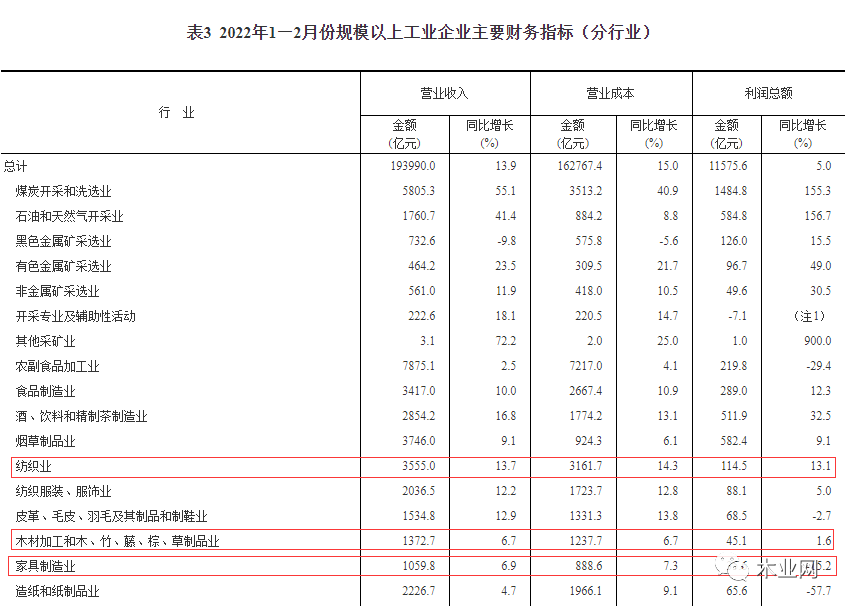 公告顯示,1-2月,全國家具制造業(yè)營業(yè)收入1059.8億元,同比增長6.9%;營業(yè)成本888.6億元,同比增長7.3%;利潤總額35.6億元,同比下降15.2%。紡織業(yè)營業(yè)收入3555億元,同比13.7%;營業(yè)成本3161.7億元,同比增長14.3%;利潤總額114.5億元,同比增長13.1%。