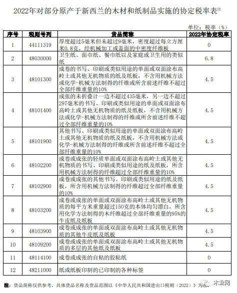 為履行《升級議定書》及相關換文規定,國務院關稅稅則委員會發布公告,自4月7日起對部分原產于新西蘭的木材和紙制品稅目實施協定稅率,后續年度稅率自當年1月1日起實施。